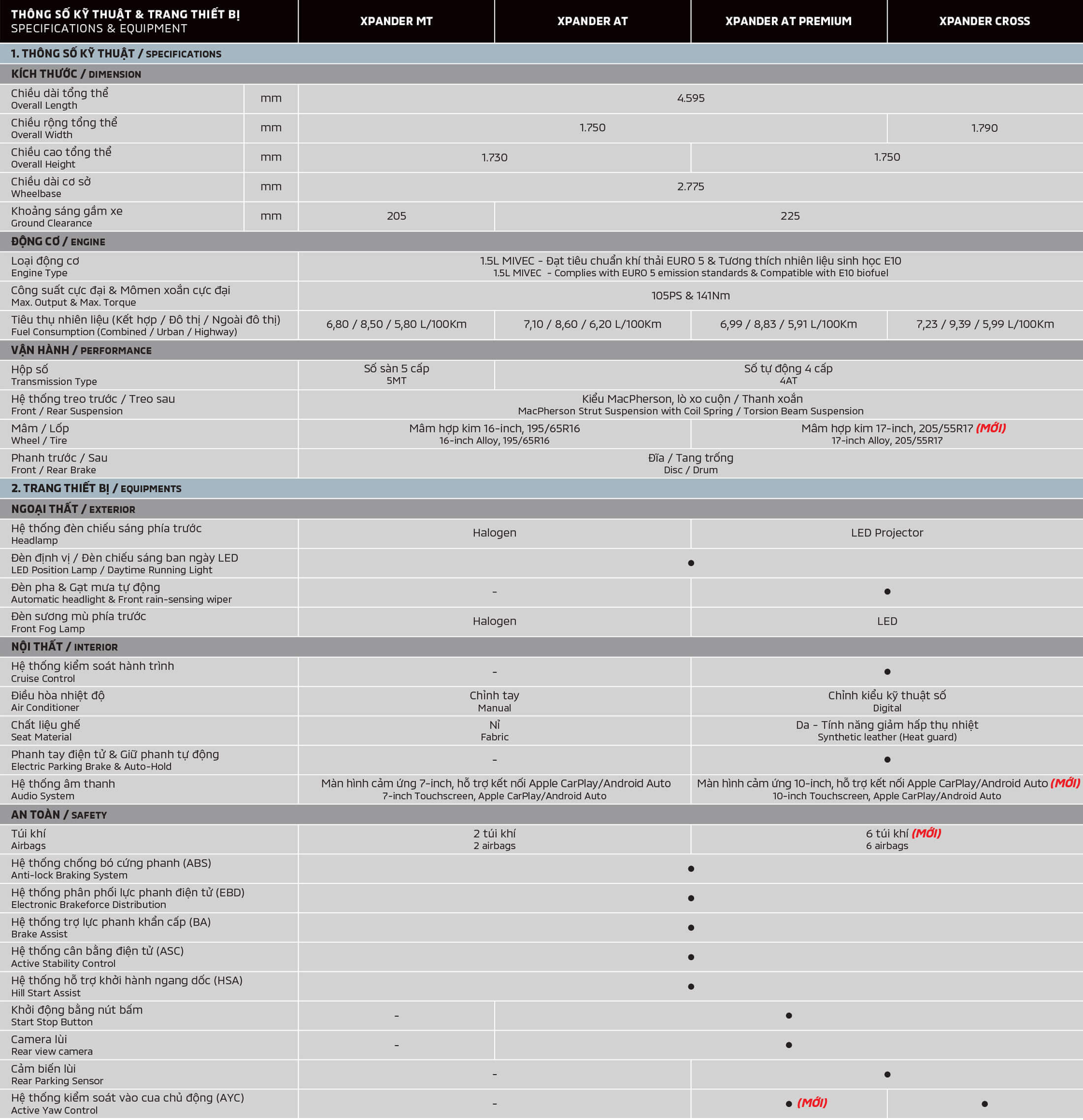 Mitsubishi Xpander 2025 mới với phong cách crossover, sở hữu diện mạo hiện đại với thiết kế lưới tản nhiệt, cản trước, cản sau và mâm xe 17 inch hoàn toàn mới; nội thất đẳng cấp, rộng rãi với màn hình người lái 8 inch, màn hình giải trí 10 inch kết nối không dây, vô lăng 3 chấu mới cùng trang bị 6 túi khí và hệ thống kiểm soát vào cua chủ động (AYC).